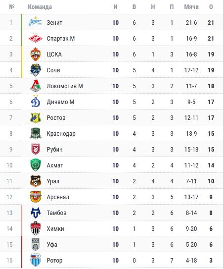 Как-то незаметно, но уже треть чемпионата уже позади! Какие-то итоги подводить, конечно, ещё рано, но что-то уже начинает проявляться. Из неожиданного – слишком низко располагается «Краснодар» и слишком высоко расположился «Сочи». Да ещё и «Уфа» как-то не на своем месте. А в остальном, в принципе, обычная картина. Только «Спартак» и «Локомотив» местами поменять нужно.
