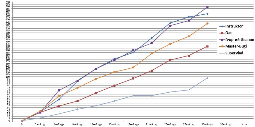 Победителем тридцатого тура стал: Master-Bugi с 11+1У+1Ч = 13 набранными очками :flag: